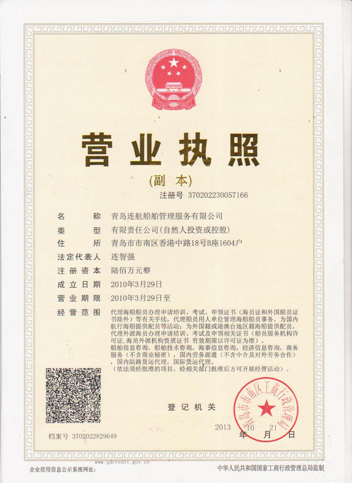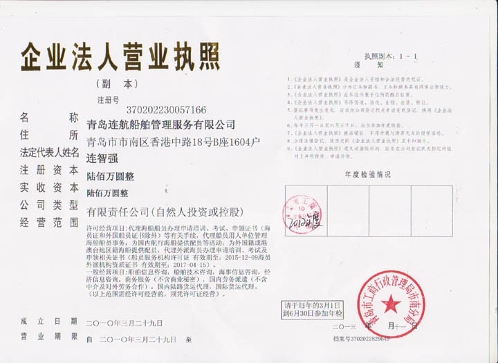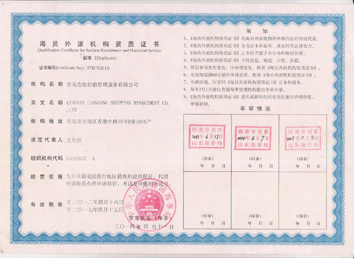 2012年04月青島連航船舶管理服務(wù)有限公司取得《海員外派機構(gòu)資質(zhì)證書》,為海洋船舶提供配員,代理船員用人單位管理海洋船舶船員事物,代理海洋船舶船員申請培訓、考試、申請證書等業(yè)務(wù)。